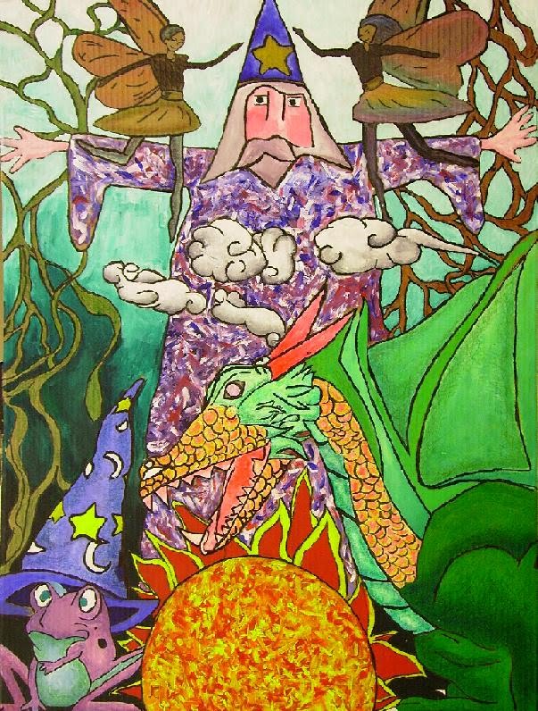 Same as the last: 36" x 46", acrylic, ink, pencil, colored pencil on cardboard. This one was done by three seventh graders. One of them loves to draw anime. She drove the bulk of the composition. The sun and the wizard's coat are just amazing. I keep thinking this one looks like a miniture. I mean it looks like a scene I'd find if I pulled apart some bushes and peered into secret fairy kingdom.